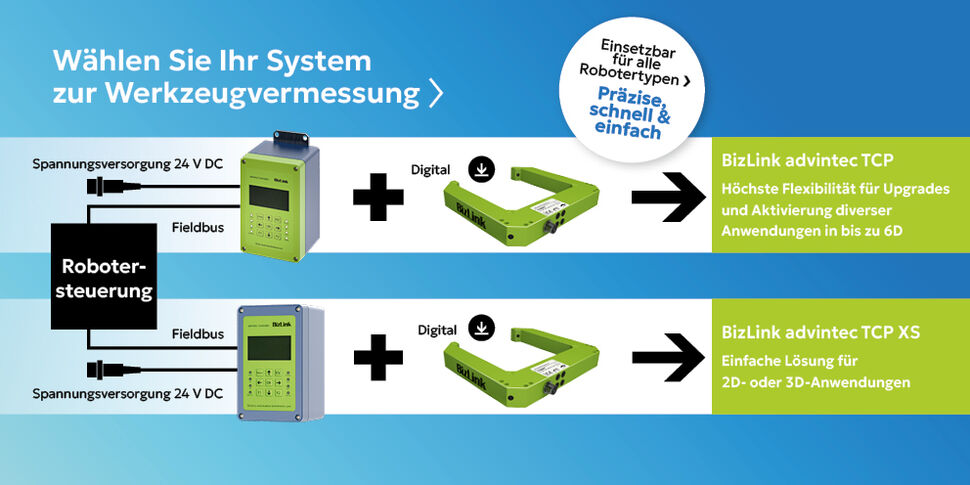 BizLink advintec TCP vermisst das Werkzeug bzw. die Vorrichtung elektronisch in bis zu sechs Dimensionen. Es korrigiert das Roboterprogramm automatisch um die Toleranzabweichung und sorgt dafür, dass das Werkzeug stets an der korrekten Position arbeitet. BizLink advintec TCP ist ein hochpräzises Kalibriersystem, das für alle Robotertypen und die meisten Roboter-Werkzeuge einsetzbar und somit herstellerunabhängig ist.