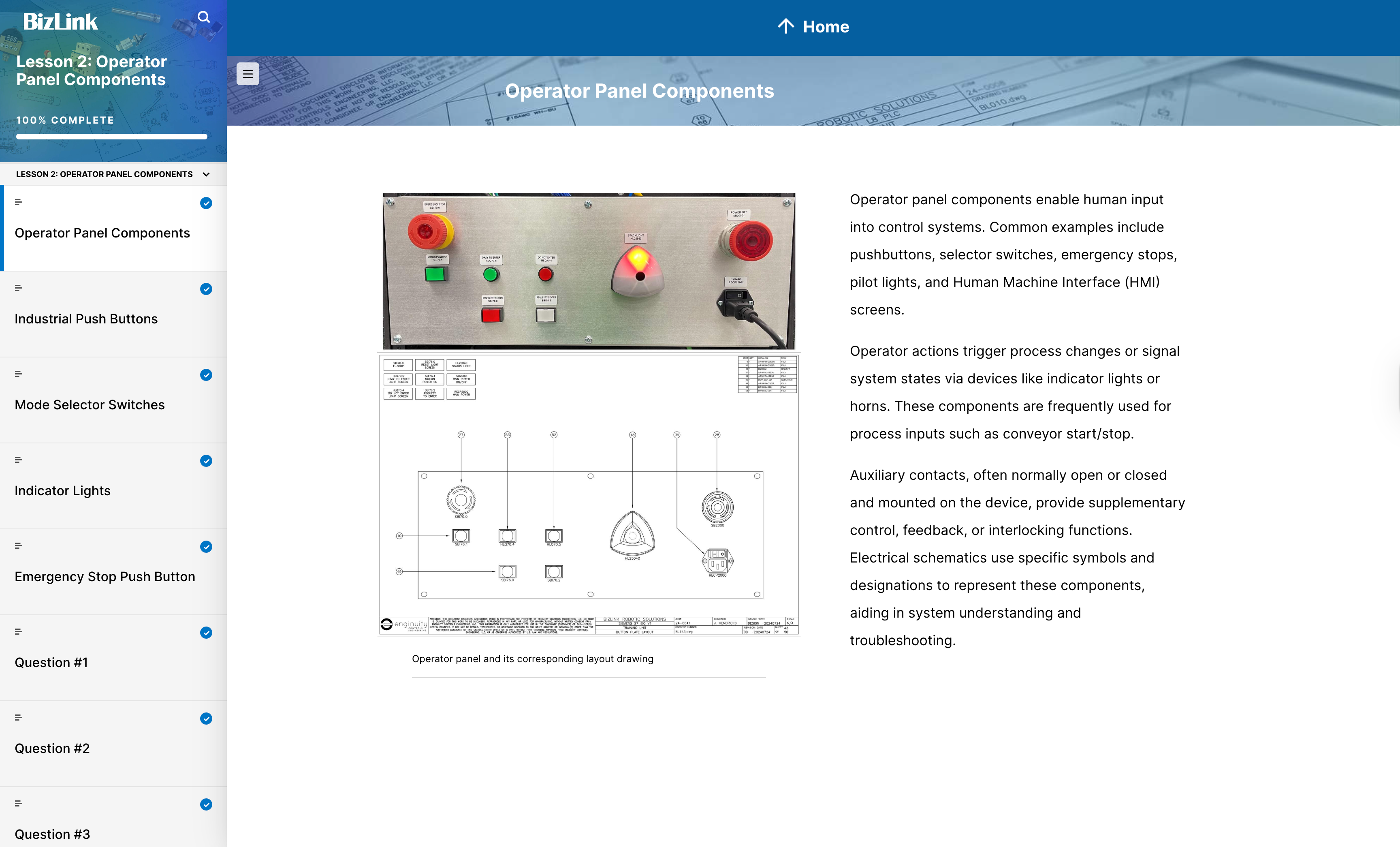 Diseñado para maximizar la participación y la retención del conocimiento, el curso autodirigido Lectura de planos eléctricos industriales de BizLink está dirigido tanto a técnicos nuevos como a profesionales con experiencia. El curso ayuda a garantizar que todo el equipo de automatización adquiera una comprensión coherente de cómo los planos eléctricos documentan el funcionamiento del sistema y las relaciones entre los componentes.
