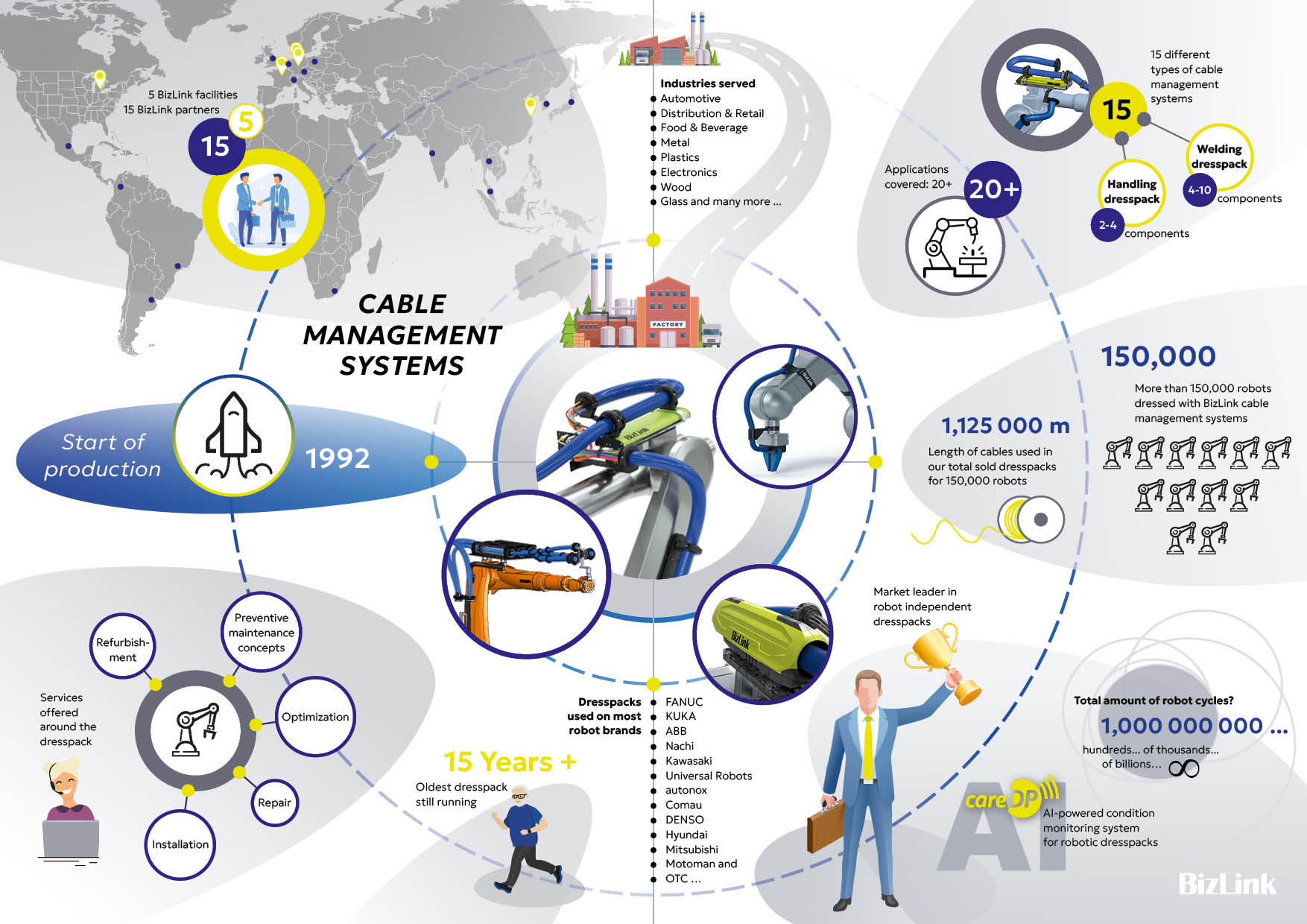 Con décadas de experiencia en robótica industrial, BizLink diseña, ensambla e instala dresspacks robóticos estándar y personalizados para robots industriales y máquinas especiales. Nuestras soluciones están diseñadas para garantizar una transmisión de energía fiable, una larga vida útil y una reducción de los tiempos de inactividad, incluso en condiciones de operación exigentes.