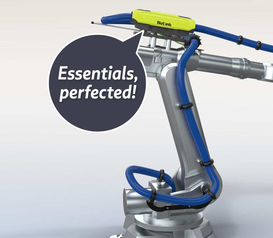 To that end, BizLink offers robotic dresspacks to suit any industrial application. One is the LSH 3 premium dresspack, which has a corrugated tube that extends all the way to the exit point at axis 3, further protecting power and control systems within the tube. This tube features a side-mount bracket and an external design that fits the size of the robot, which simplifies repairs while offering a smaller footprint, less weight, and more strength and flexibility.